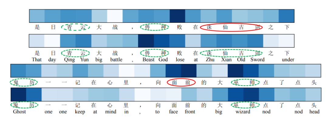 我们对两种领域表示方案得到的元素级别的相关性权重进行了可视化,如图4,样本级别的领域表示(下方)相较于领域级别的领域表示(上方)能更好地提取出各样本的领域特征,从而得到更好的元素级别的相关性权重。