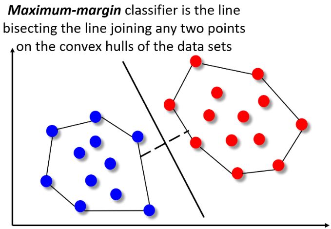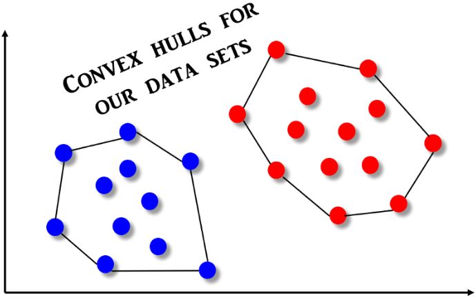 SVM 算法背后的形式数学相当复杂,但从直观地我们可以理解为这是一种称为 Convex Hull 的特殊几何结构。