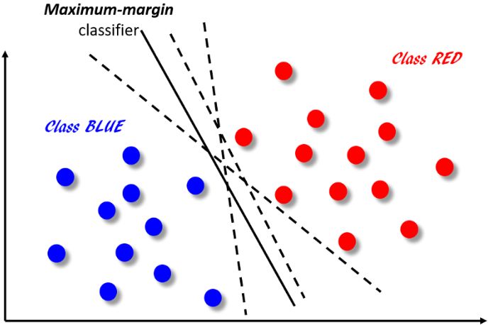 SVM 的核心思想主要如下图所示,它的最终目标是将二维平面中的点分为红蓝两类,这可以通过在两组点集之间创建分类器边界(利用分类算法从带标记的数据中学习边界信息) 来实现。下图中展示了一些可能的分类器,它们都将正确地对数据点进行分类,但并非所有分类器都能使得分类后最接近边界的数据点具有相同的边距(距离)。从下图中我们可以看出,其中只有一个分类器能够最大化红色和蓝色点之间的距离,我们用实线表示该分类器而用虚线表示其他分类器。这种边距最大化的效用是尽可能地放大两个类别之间的距离,以便对新的点分类时分类器的泛化误差尽可能小。