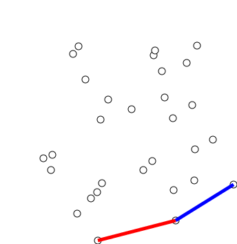 我们通过下面这个动画来说明这个问题!这里,我将展示用于确定一组点的凸包的Graham’s scan 算法。该算法能够沿着凸包的边界顺序,依次找到其所有的顶点,并通过堆栈的方法有效地检测和去除边界中的凹陷区域。