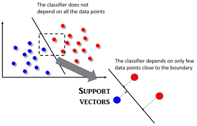 SVM 算法最明显的特征是分类器不依赖于所有数据点,这不同于依赖每个数据点特征并将其用于构造分类器边界函数的逻辑回归算法。实际上,SVM 分类器会依赖于一个非常小的子数据点集,这些数据点最接近边界,同时它们在超平面中的位置可以影响分类器边界线。由这些点构成的向量唯一地定义并支持分类器函数,因此我们把这种分类器称之为“支持向量机”,它的概念图解如下图所示。