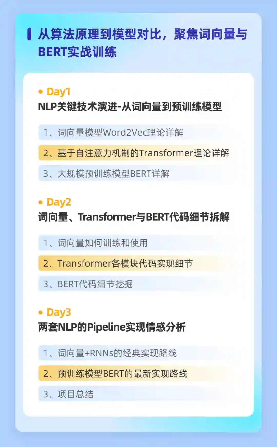 本次训练营为期3天,主要分为三大模块,包括:NLP关键技术演进;词向量、Transformer与BERT代码细节拆解和两套NLP的Piprline实现情感分析。