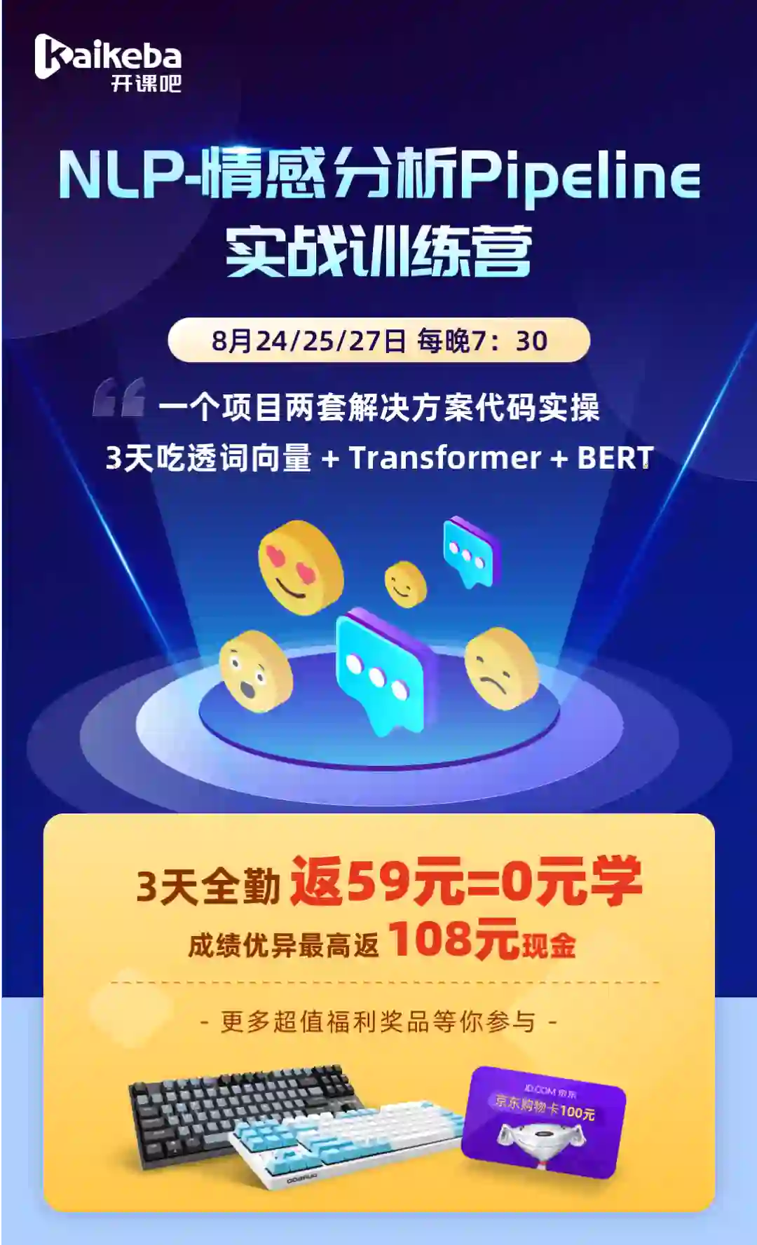 本号强烈推荐你参加《NLP-情感分析Pipeline实战训练营》,开课吧人工智能高级导师将会从算法原理到模型对比,聚焦词向量与BERT实战训练,帮你掌握必备知识点并掌握解决代码实操的能力。内容不错,推荐给你们。