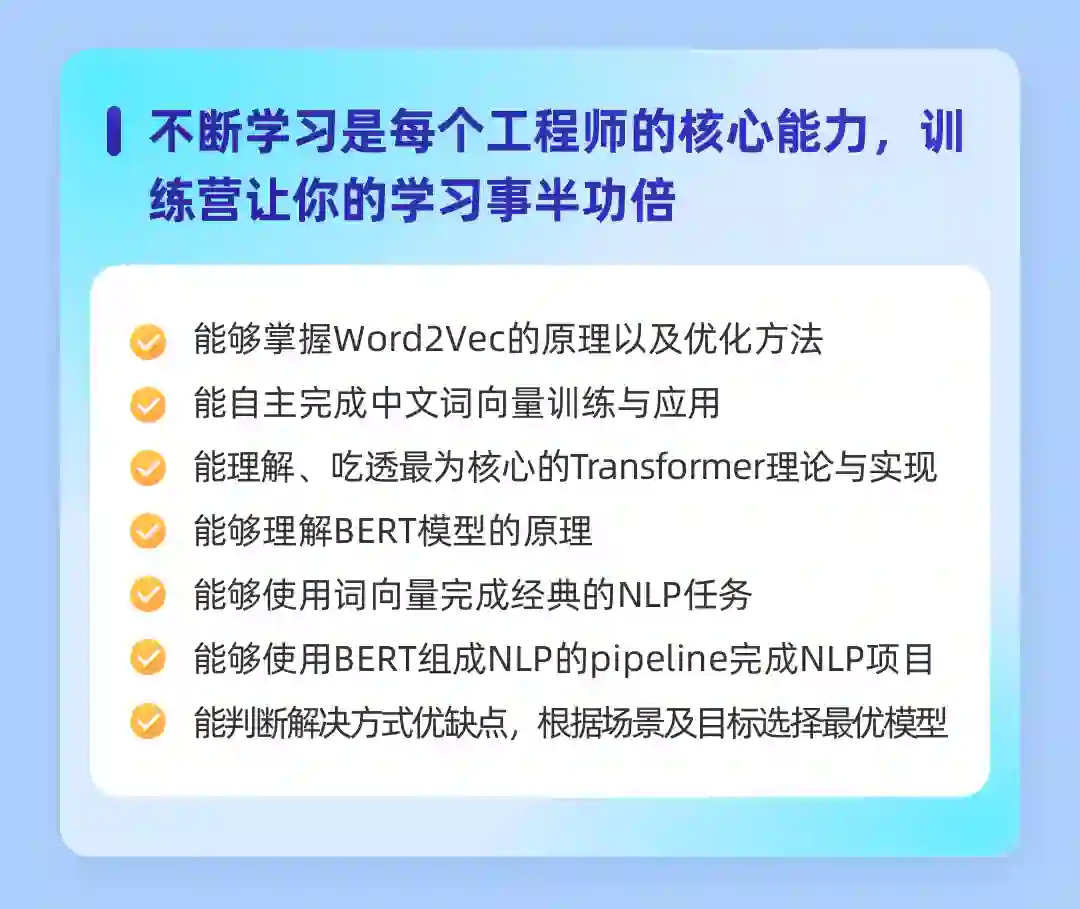 如果你是以上人群,那么这次训练营十分适合你。从算法原理到模型对比,聚焦词向量与BERT实战训练,实现进阶发展!