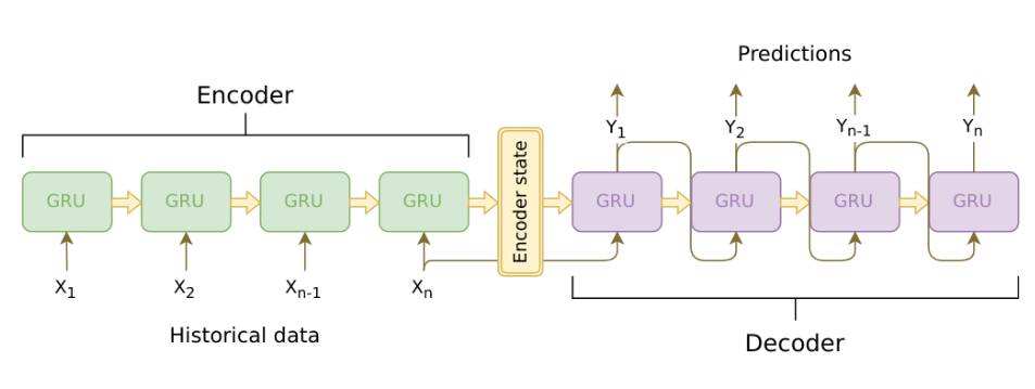 seq2seq 天然适合该任务:我们根据先前值(包括先前预测)的联合概率(joint probability)预测下一个值。使用先前预测可保持模型稳定,因为误差会在每一步累积,如果某一步出现极端预测,则有可能毁了所有后续步的预测质量。