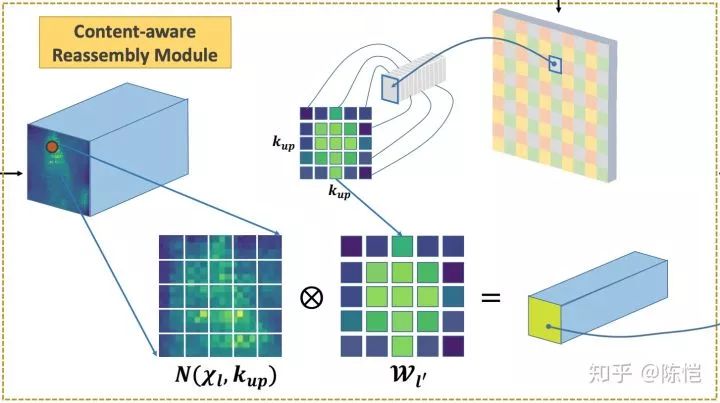 对于输出特征图中的每个位置,我们将其映射回输入特征图,取出以之为中心的  的区域,和预测出的该点的上采样核作点积,得到输出值。相同位置的不同通道共享同一个上采样核。