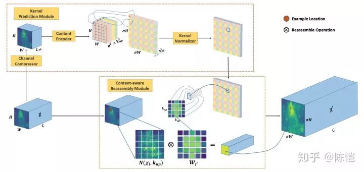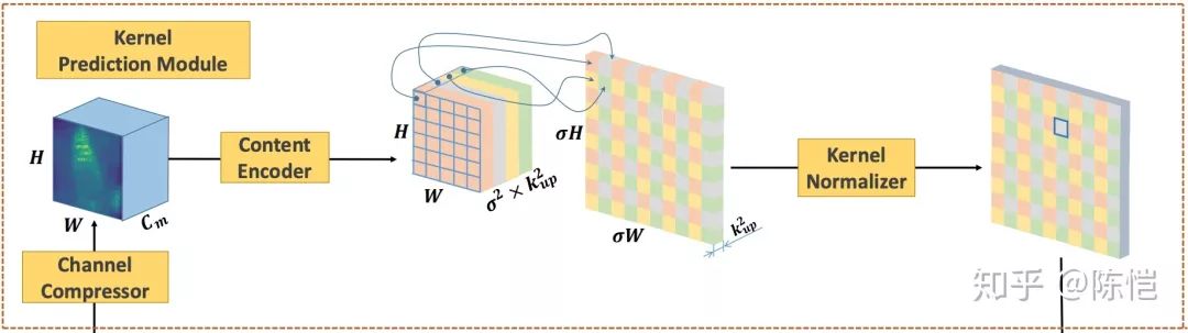 的输入特征图,我们首先利用上采样核预测模块预测上采样核,然后利用特征重组模块完成上采样,得到形状为