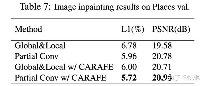 我们也尝试把 CARAFE 应用在 low-level 任务比如 image inpainting 中,同样取得了较大的提升,刷新了 SOTA。