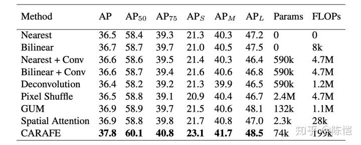 以 Faster R-CNN w/ FPN 为例,我们对比了 CARAFE 和其他上采样算子的性能以及参数量和计算量。在性能明显优于其他算子的情况下,CARAFE 保持了轻量级的特性,参数量和计算量都较小。