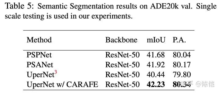 在语义分割任务中,我们将 UperNet(为啥用 UperNet,因为有好用的开源 code 啊)作为 baseline,用 CARAFE 替换其中的上采样操作,取得了显著的提升。