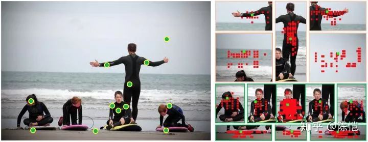 我们将 FPN 中的上采样操作替换成 CARAFE,并可视化上采样的区域和权重。对于高层特征图中不同的点,我们展示在 CARAFE 多次上采样后的采样核权重较大的点,可以看到采样点会集中在物体区域而忽略背景区域,达到 content-aware 的效果。