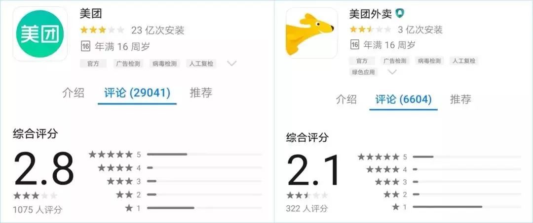 现在,在华为手机应用市场上,美团APP的评分低至2.8分,而美团外卖的评分更是低至2.1分(满分为5分)。