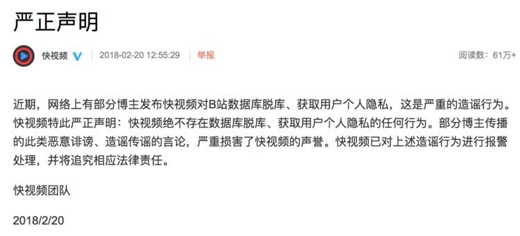 在快视频的声明和给 B 站用户的信中,快视频方面两次的重担都是否认数据库拖库和获取用户隐私的问题。而且除了 B 站用户,快视频目前好像并没有给其他平台用户道个歉的意思。