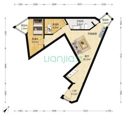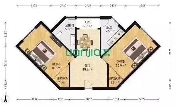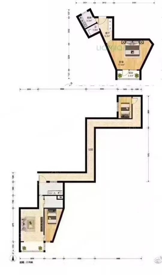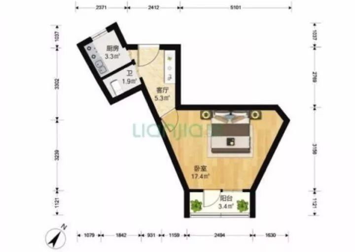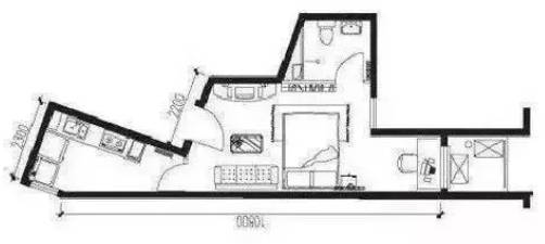 还有高跟鞋户型,一室一厅一厨一卫,房间布局倒还算紧凑合理,没有太多不便,不过卧室的北面墙也真是够斜(邪)乎了。