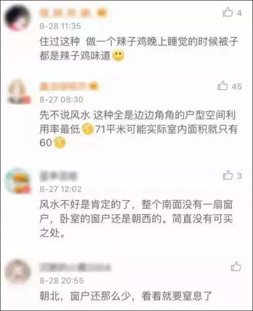 有网友评论,“这种户型真是天才的设计———三角形最稳固,至少地震结实一点”,“楼主这房子有个好处,算面积特方便,三角形面积=底*高/2,哈哈哈哈”。