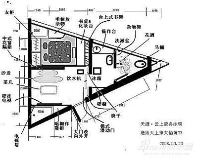 这个户型出自网友“天上掉大馅饼”在天涯发的帖子《应该是天涯上最差的小户型了,求助……》。一个横卧的等腰三角形,拦腰被隔成一个小三角和一个梯形,梯形就是卧室,小三角兼顾厨房和卫生间的功能,还有一整面墙是玻璃。“三明治”户型,真是名符其实啊!