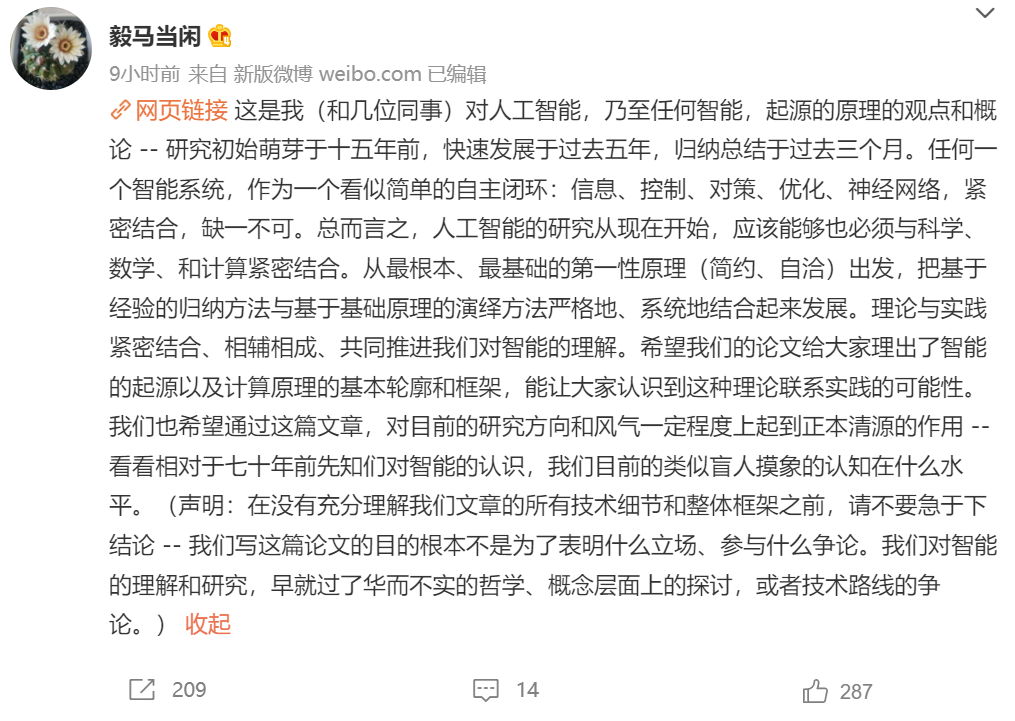 马毅教授表示:这篇文章把过去五年自己的工作以及智能七十多年的发展有机结合起来。并表示自己一生从未在一篇文章上花这么多精力和时间。希望这篇文章能对现在的研究方向和品味产生正面的影响。