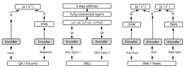 「Universal Sentence Encoder」这篇论文介绍了一种模型,它通过增加更多任务来扩展上述的多任务训练,并与一个类似 skip-thought 的模型联合训练,从而在给定文本片段下预测句子上下文。然而,我们不使用原 skip-thought 模型中的编码器 - 解码器架构,而是使用一种只有编码器的模型,并通过共享编码器来推进预测任务。利用这种方式,模型训练时间大大减少,同时还能保证各类迁移学习任务(包括情感和语义相似度分类)的性能。这种模型的目的是为尽可能多的应用(释义检测、相关性、聚类和自定义文本分类)提供一种通用的编码器。