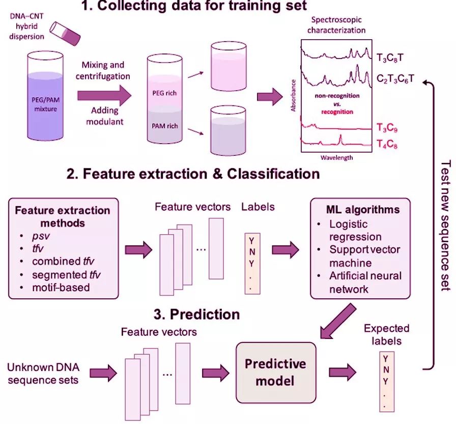 来自美国Lehigh大学化学与生物分子工程系的Anand Jagota等,基于现有实验序列数据集,报告了一种用机器学习分析来预测识别DNA序列的有效方法。为便于分析、解释,他们将SWCNT识别的DNA序列限制为只有2种碱基组合(C&T)的、12个碱基构成的短序列。以已知数据训练机器学习模型,并将实验测试过的新序列数据集添加到原始数据集,重新训练模型。通过交叉验证和新测试集上的预测误差来评估预测性能,并通过特征表示方法改进模型性能。结果显示准确预测识别序列的频率从原始训练集的10%显著提升到> 50%。他们所获得的机器学习模型,有可能为更普遍的序列选择问题提供新的途径。