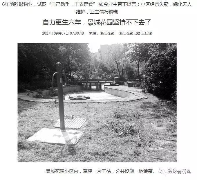 市面上还真有业主自我管理的例子。来看一个《钱江晚报》的新闻,这个小区的位置很好,房龄15年,以大户型为主,建成时算是蛮高档的。从2011年开始,这个小区开始尝试自我管理,最后证明是条死路: