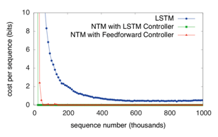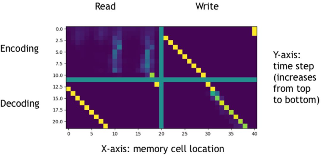 上图中横坐标为存储单元的位置,纵坐标为时刻(从上至下时刻递增),使用绿色线分隔得到的四张图的上边两张对应编码阶段,下边两张对应解码阶段,左边两张和右边两张分别对应读和写,图中像素点约接近黄色代表强度越大。进过分析,可知NTM在拷贝任务上学习到的策略为: