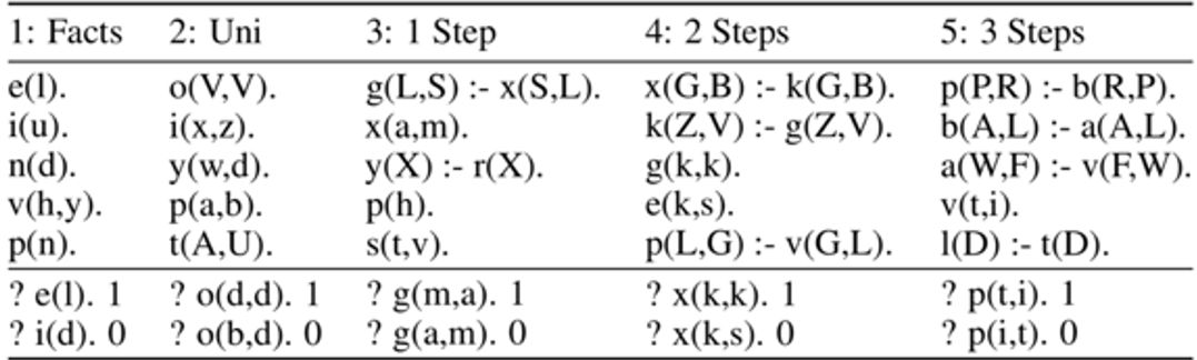 这里的逻辑推理任务与之前的阅读理解问答任务类似,均是给定一些事实和问题,给出答案,都需要回退式链式推理,不同的是本任务是用prolog程序表达的。这里不对相关背景知识详细展开介绍。一些样例如下表所示: