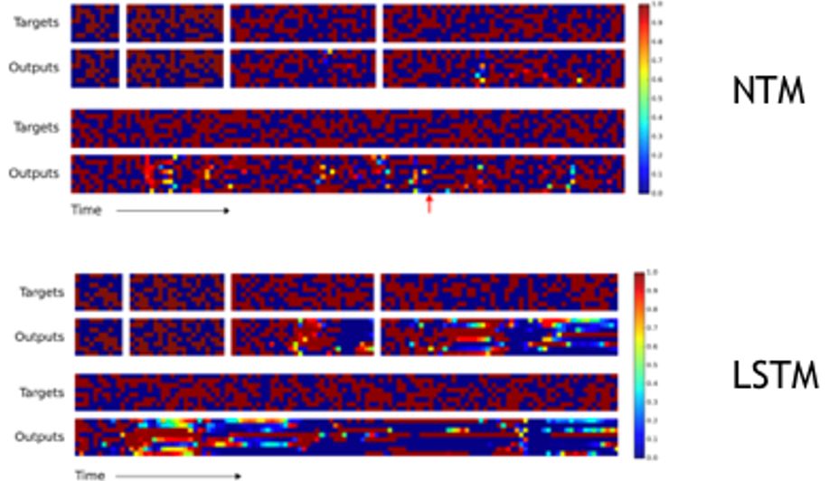 这两张图分别为NTM和LSTM的样例测试结果,这里每一个模型都分别在同训练集分布的测试集上(序列长度较短)和非同分布测试集上(序列长度较长)测试,可以发现NTM在这两种情形下均可实现较准确的拷贝,而LSTM仅局限于同分布测试集上的泛化。
