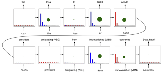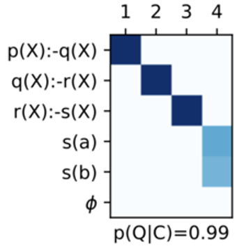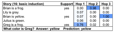该模型在这个任务上学习到的策略为上文提及的backward chaining,将每一个推理时刻模型关注到不同句子的强度可视化,可以得到下图: