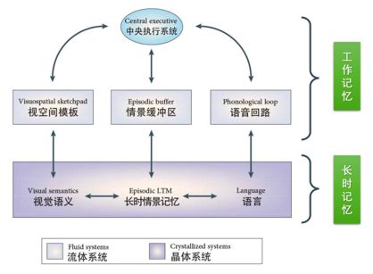 这次介绍的主要内容也主要围绕着短时记忆中的工作记忆展开,长时记忆也略有涉及。工作记忆主要是指个体在执行认知任务中, 对信息暂时储存与操作的能力。工作记忆的概念强调临时存储以及对存储的信息进行加工处理的能力,如下图所示: