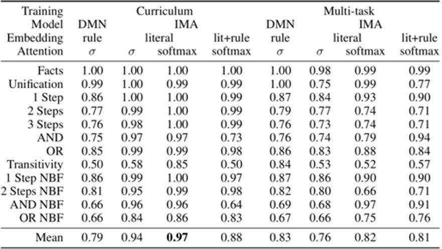 每一列代表一个样本,黑色字体的句子为已知事实,蓝色字体的句子为问题,红色字体标出的是答案。解决这类问题的一般策略为根据答案在已知事实中逆向回溯寻找答案(backward chaining,回退式链式推理)。下表给出各个模型的准确率对比: