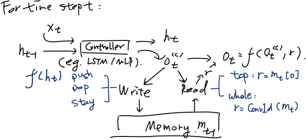 ;存储模块可以是各种数据结构组织的模型(如栈、队列或者是一个可随机访问的数组),类比于各种自动机的存储模块;读写机制则与存储模块的数据结构类型相一致。最后每一时刻都经过一个输出函数f,将控制器输出