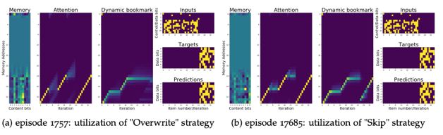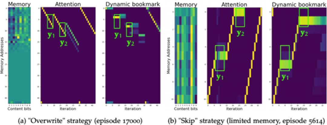 而实际实验中发现这两种策略都是可以学习到的。从而一个自然产生的问题就是如何让模型学到特定规则,而实验发现,模型在训练初期往往会学习到覆盖策略(由于这样的策略较简单,容易学习到),在训练的后期会逐渐转为略过策略(由于这种策略能更佳高效的利用存储空间),两个阶段(episode 1757与episode 17685)的策略可视化如下图所示: