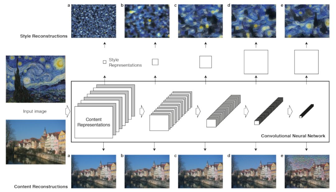 但是我们该如何得出这些损失函数呢?也就是说,我们如何从数学上接近内容和风格的概念?Gatys,Ecker 和 Bethge 等人在他们具有里程碑意义的风格迁移论文「A Neural Algorithm of Artistic Style」(https://arxiv.org/abs/1508.06576)中提出,这个问题的答案在于卷积神经网络(CNN)的架构。
