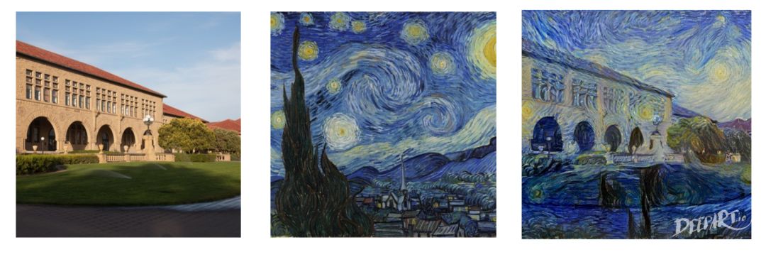这究竟是怎么做到的呢?我们可以认为每张图片由两个部分组成:内容和风格。「内容」就是图片中所展示的客观事物(如左图中斯坦福大学的中心广场),「风格」则是图画的创作方式(如梵高《星月夜》中的螺旋、多彩的风格)。风格迁移是用另一种风格对一幅图像进行二次创作的任务。