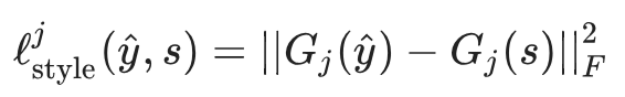 令 Gj(x) 为 ϕj(x) 的 Gtam 矩阵。相应的风格损失可以用以下形式计算,其中 F 表示弗罗贝尼乌斯范数(Frobenius norm):