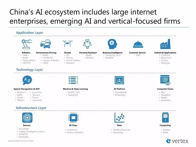 • 中国互联网巨头百度、阿里巴巴和腾讯引领中国AI市场,还有成千上万的初创企业在不同的AI领域和应用建立服务