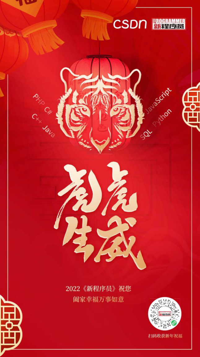 金牛辞冬去,瑞虎迎春来。值此辞旧迎新、万象始更新之际,CSDN全体员工向一直以来关心和支持我们的读者、用户、技术专家、程序员朋友们致以最美好的新年祝福,祝大家虎年大吉,虎虎生威,阖家欢乐,身体健康,工作顺利,万事如意!在新的一年虎跃龙腾、写代码虎头虎尾、一虎之力“BUG”扫光光!