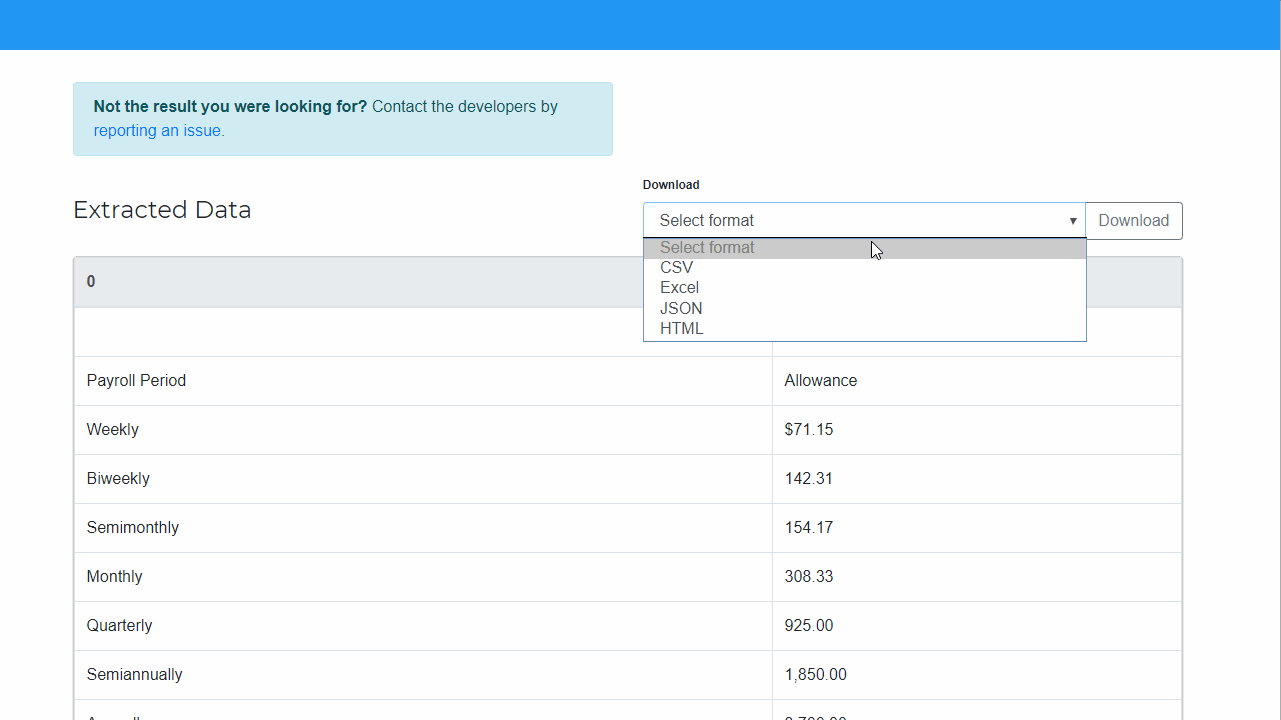 最后,你可以查看提取的表格并将其下载为 CSV 或 Excel 文件。Excalibur 还支持 JSON 和 HTML 格式。