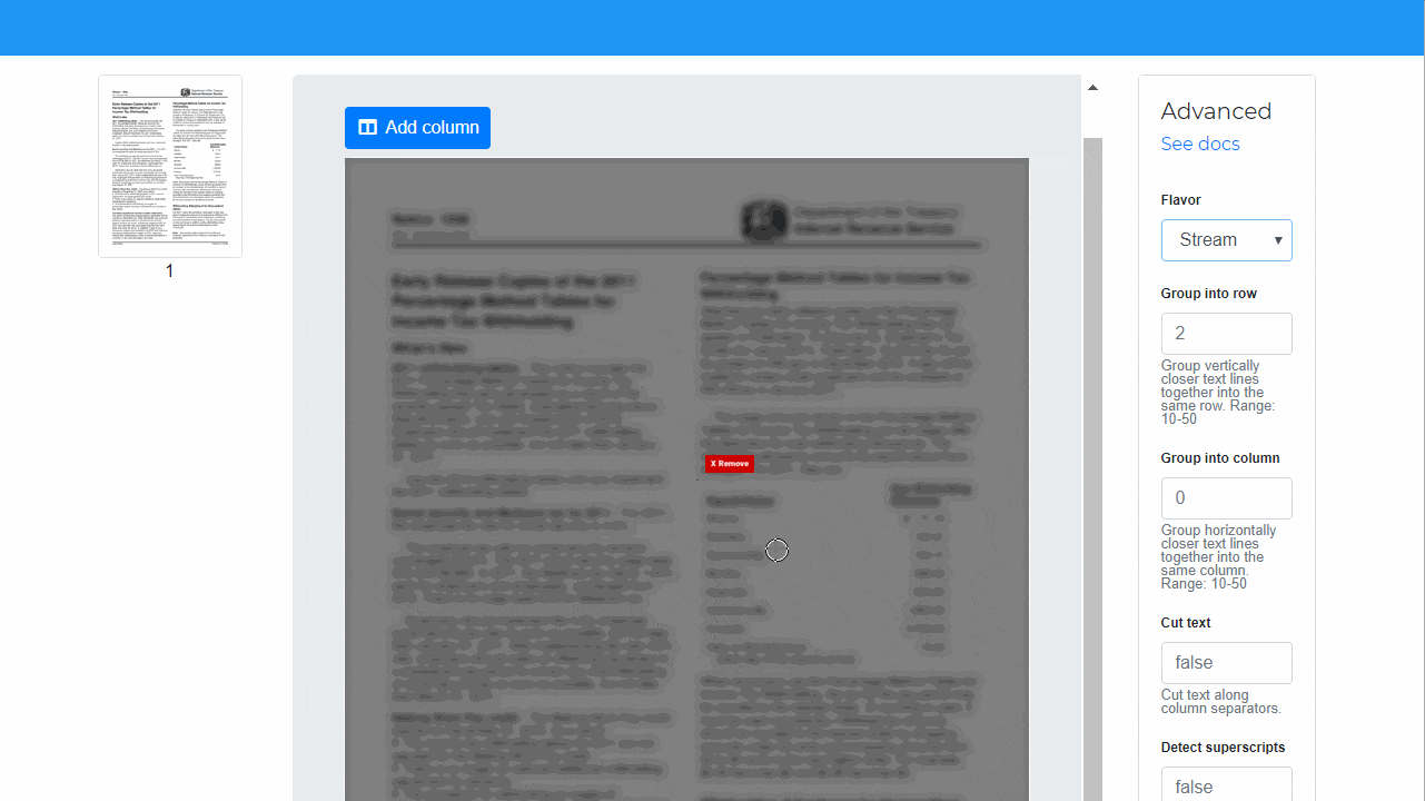 如果表格深埋在文本内部并且自动检测失败,则可以通过绘制表格区域和列分隔符进行操作。