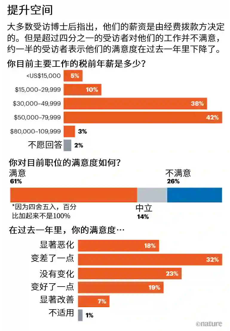 调查还发现了博士后对现状和未来的普遍焦虑。当被问及博士后是否满足预期时,32%的受访者表示不及预期,只有12%的人表示超过预期。超过一半的受访者(56%)对自身的职业前景表示悲观,不到一半的受访者表示会向年轻时的自己推荐学术界的工作。一位受访者在留言区指出:“(博士后)没什么选择了。”(见“博士后不被看重”。)