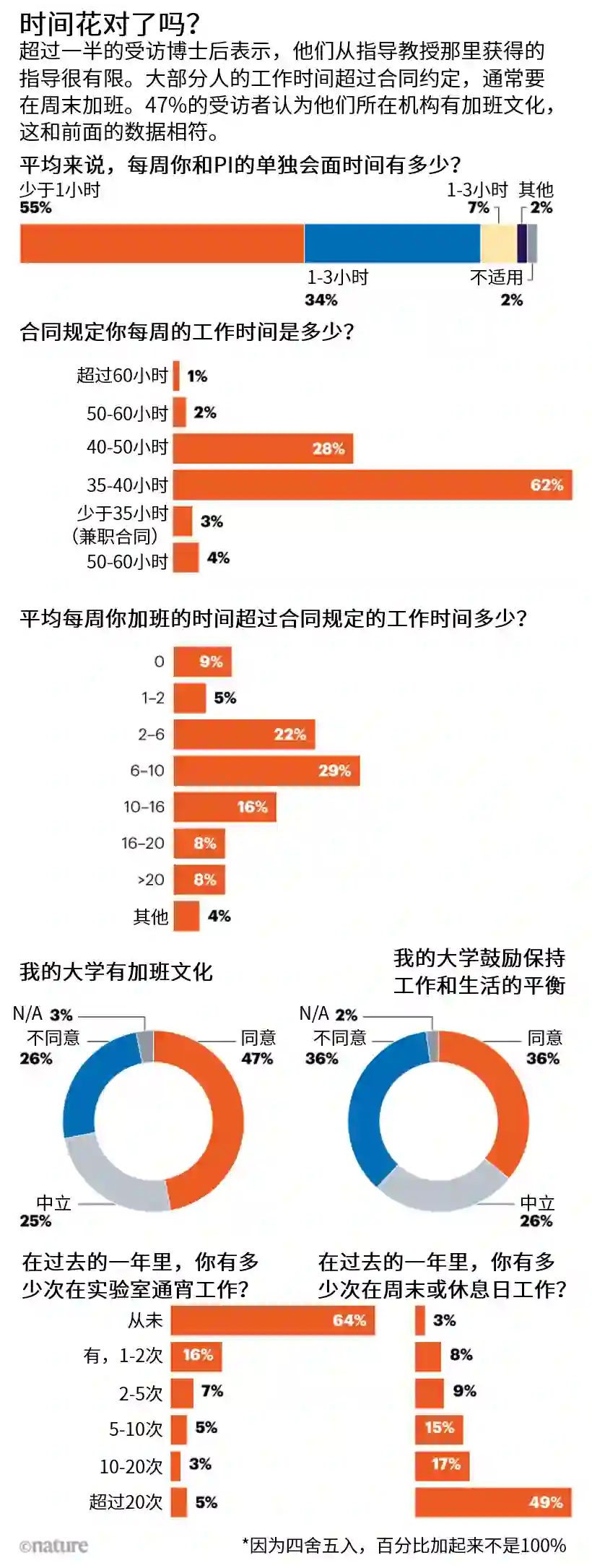 受访者指出,他们从PI或指导者那里并没有获得什么指导。超过一半(55%)的受访者指出,每周他们只有不到一小时的时间和实验室PI面对面交流,三分之一的人表示,每周有1-3小时的面对面交流时间(见“时间花对了吗?”)。一位受访者在评论区写道:“我做了一年半的博士后工作,和PI只面对面交流过3次。”