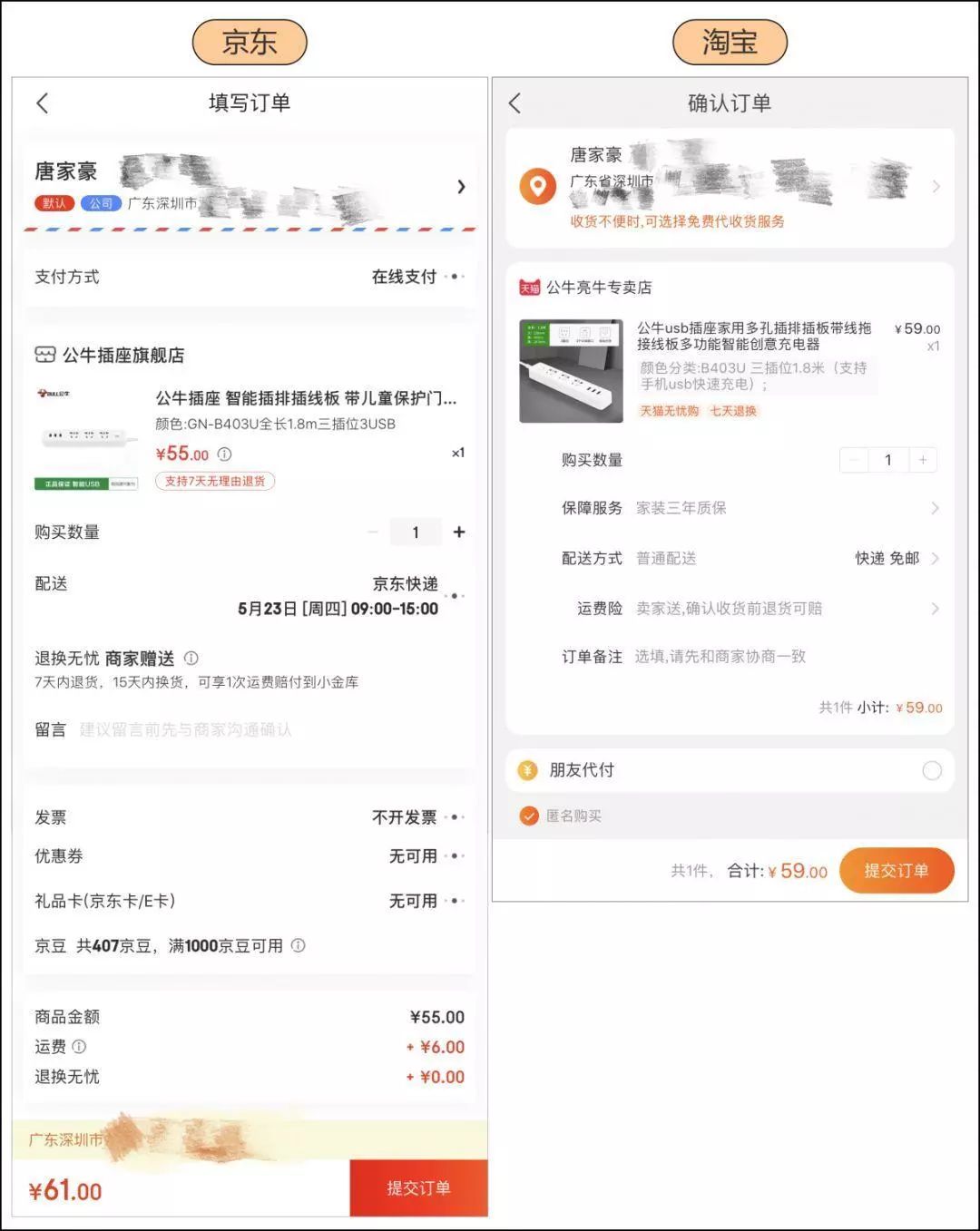 最典型的例子就是京东和淘宝的订单页面: