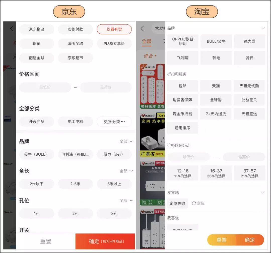 (京东的“筛选”页面 VS 淘宝的“筛选”页面)