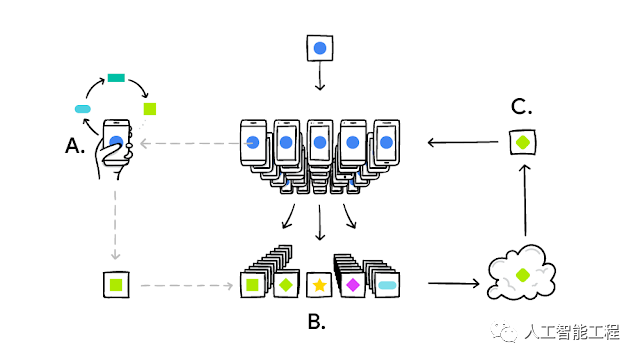 谷歌提出的联邦学习思想中,可以参考另一个介绍文章[2],给出的例子是toC的训练,例子中数据保存在个人移动设备中(手机),不需要数据上传,大体的思路是: