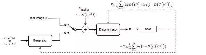 众所周知,增加鉴别器的训练难度有利于提高系统的整体稳定性。增加鉴别器训练复杂度的最著名的方法之一是在真实数据和合成数据(例如由生成器生成的图像)中添加噪声,在数学世界中,这应该是可行的,因为它有助于为两个相互竞争的网络的数据分布提供一定的稳定性。它确实是一个简单的解决方案,我建议您尝试一下,因为它在实践中可以很好地工作(即使它不能神奇地解决您可能遇到的任何不稳定问题),同时只需要很少的设置工作。话虽如此,我开始的时候使用这种技术,但过了一段时间后就放弃了,而是更喜欢其他一些在我看来更有效的技术。
