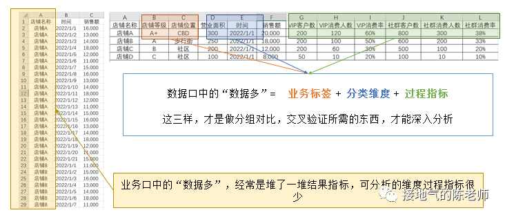很多时候,业务会说:数据有很多,就是没用起来。注意!业务部门经常把数据的条数多,当成“数据很多”。而数据分析口中的“数据很多”指的是过程指标+分类维度很多(如下图)。