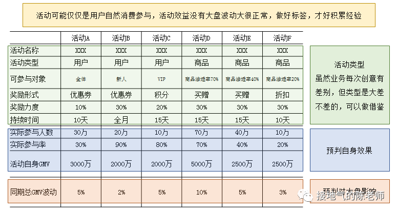 要把过去做过的活动,打上业务标签,一一对比,才能看出差异(如下图)。