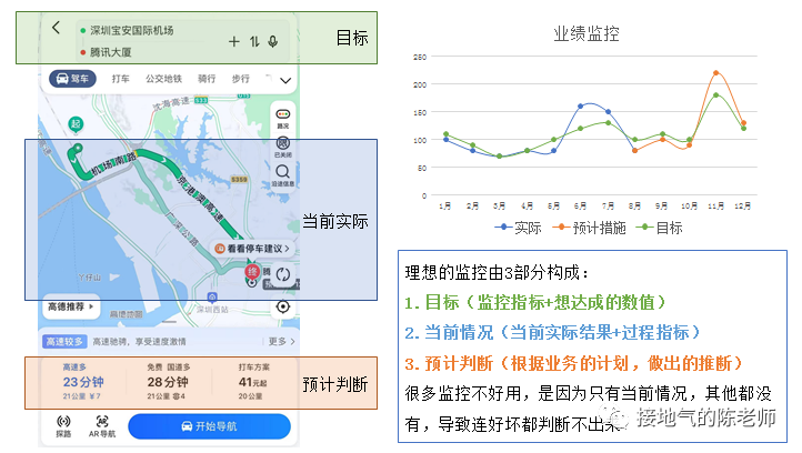 举个简单的例子,开车的时候,开个导航,导航就是个数据监控产品。只要设定好终点,导航可以根据定位自动显示起点,然后一路上提醒你: