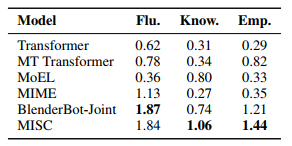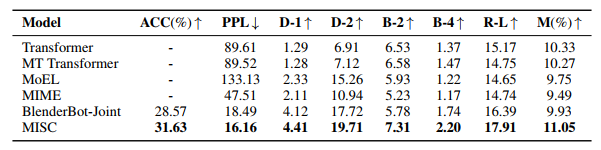选择基于MLE的seq2seq模型Transformer、将情感预测作为额外任务的MT Transformer、综合多个解码器输出的MoEL、SOTA方法BlenderBotJoint等模型,与MISC进行比较。
