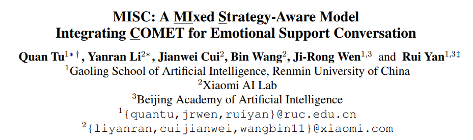 论文引用:Tu, Q. , Li, Y. , Cui, J. , Wang, B. , Wen, J. R. , & Yan, R. . (2022). Misc: a mixed strategy-aware model integrating comet for emotional support conversation.